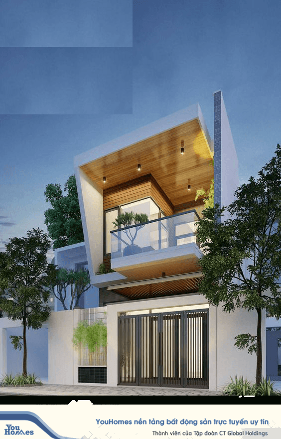 Mẫu nhà này gây ấn tượng với người nhìn ở khối lan can kính thoáng rộng cùng với trần nhà được ốp gỗ hiện đại tạo nên một hiệu ứng đậm nét và rõ nét cho không gian thiết kế kiến trúc. Cảm giác kiên cố, bền vững cùng với khoảng mặt tiền độc đáo, thể hiện những nét mềm mại và uyển chuyển cho ngôi nhà.