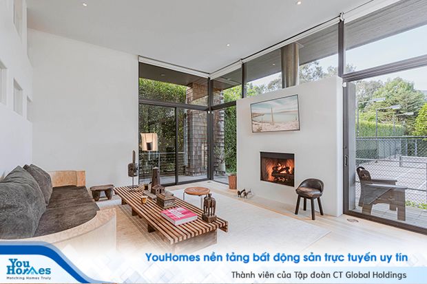 Ghế sofa sang trọng với tấm thảm lớn và lò sưởi làm cho một không gian sống trên cao cảm thấy thêm ấm cúng. Ánh sáng phản chiếu từ bên ngoài qua các ô cửa kính giúp căn phòng tràn ngập ánh sáng.