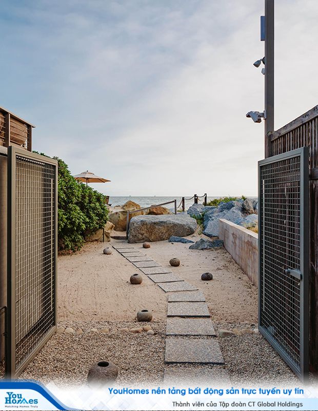 Một con đường bằng đá có cổng dẫn đến bờ biển, lý tưởng cho việc thư giãn dưới ánh mặt trời hoặc đi dã ngoại.