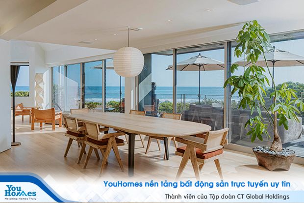 Phòng ăn với một thiết kế đơn giản với màu gỗ trầm ấm áp và có tầm nhìn đẹp mắt hướng ra biển.