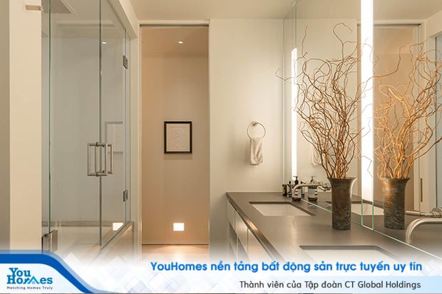Một loạt các tông màu xám, mát mẻ gây choáng trong phòng tắm giống như khách sạn.