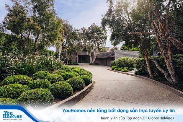 Cây bạch đàn xếp dọc theo đường lái xe mở rộng, cong để thu hút lề đường tươi tốt dẫn vào khu biệt thự.