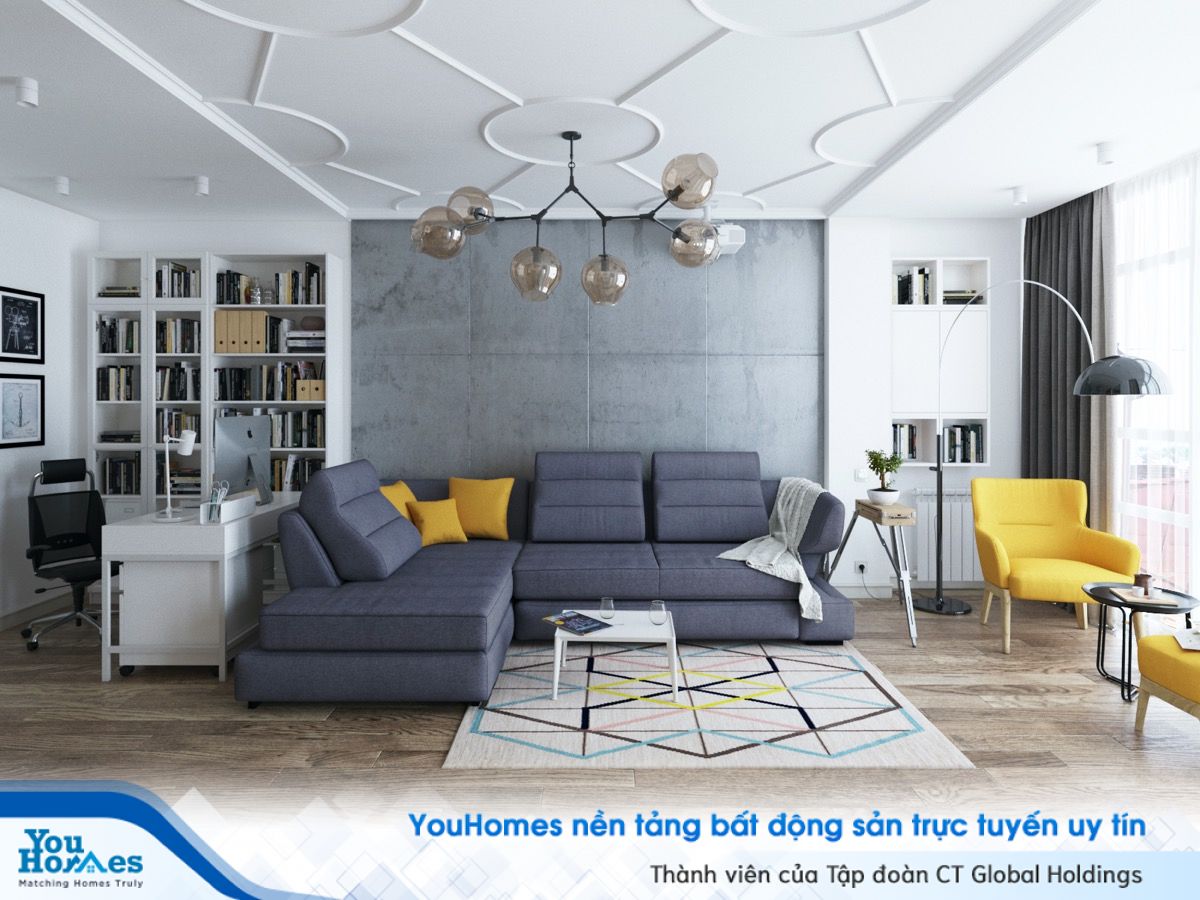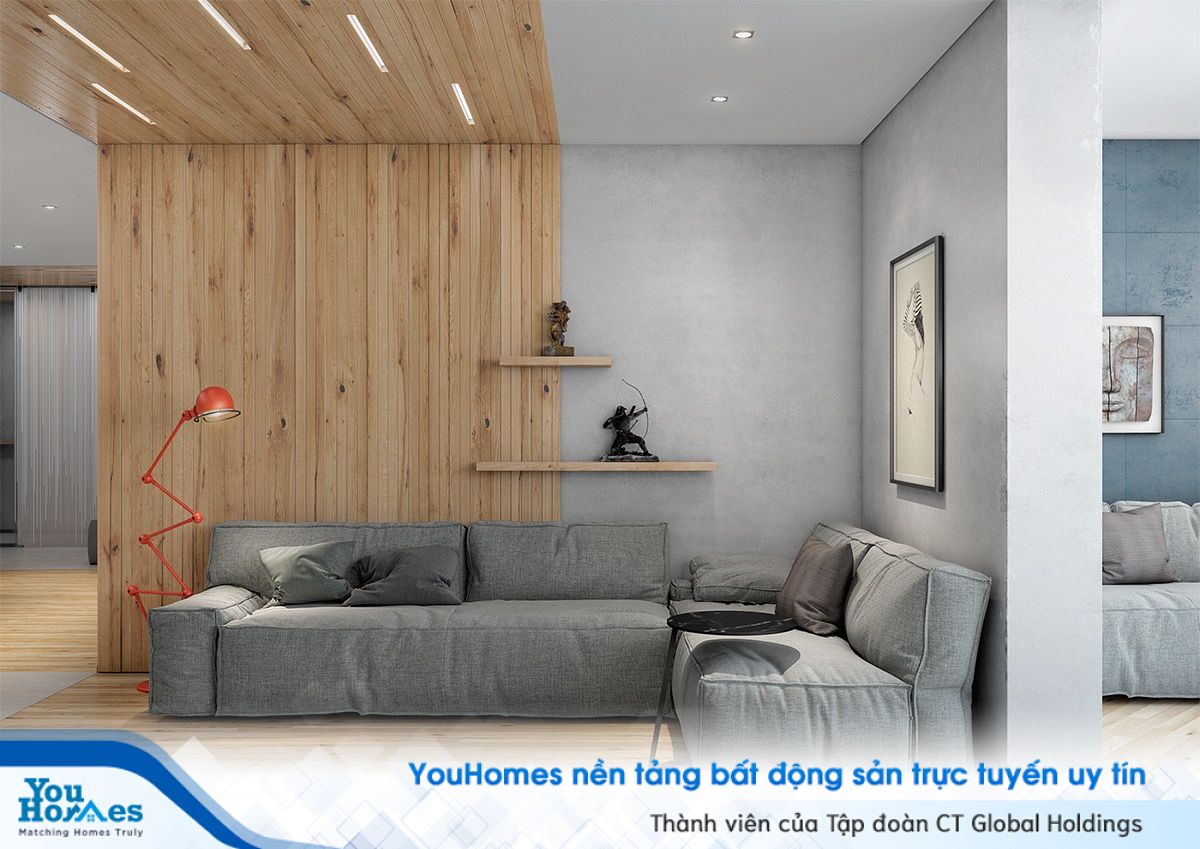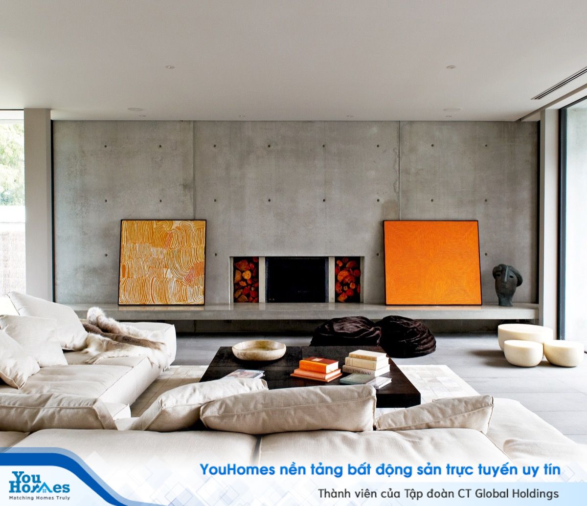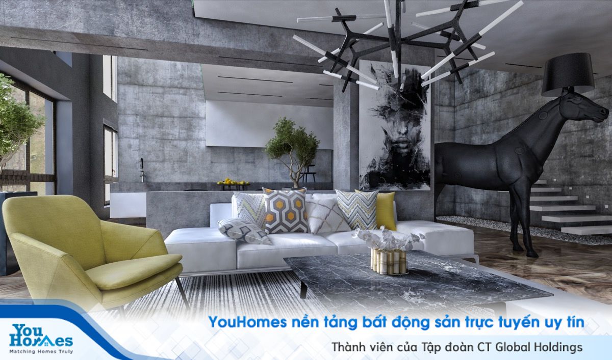 Ngoài ra các yếu tố khác tại khu vực phòng khách sẽ đi cùng với tông màu bê tông lúc đó bạn sẽ cảm nhận được không gian có sự kết nối.