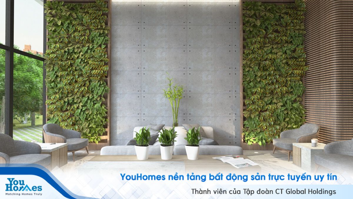 Khi mảng xanh tự nhiên được phối cùng tường bê tông sẽ làm giảm sự cứng nhắc đồng thời tạo điểm nhấn cho phòng khách.