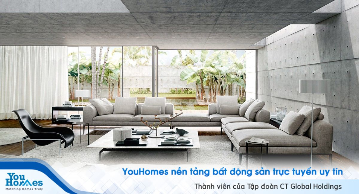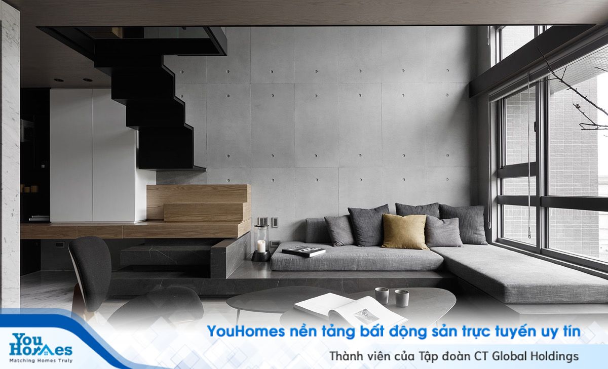 Tuy nhiên với một số gia chủ thích vẻ thô sơ của bê tông trong phòng khách thì lựa chọn đồ nội thất tông xám sẽ mang đến sự hài hòa hơn.