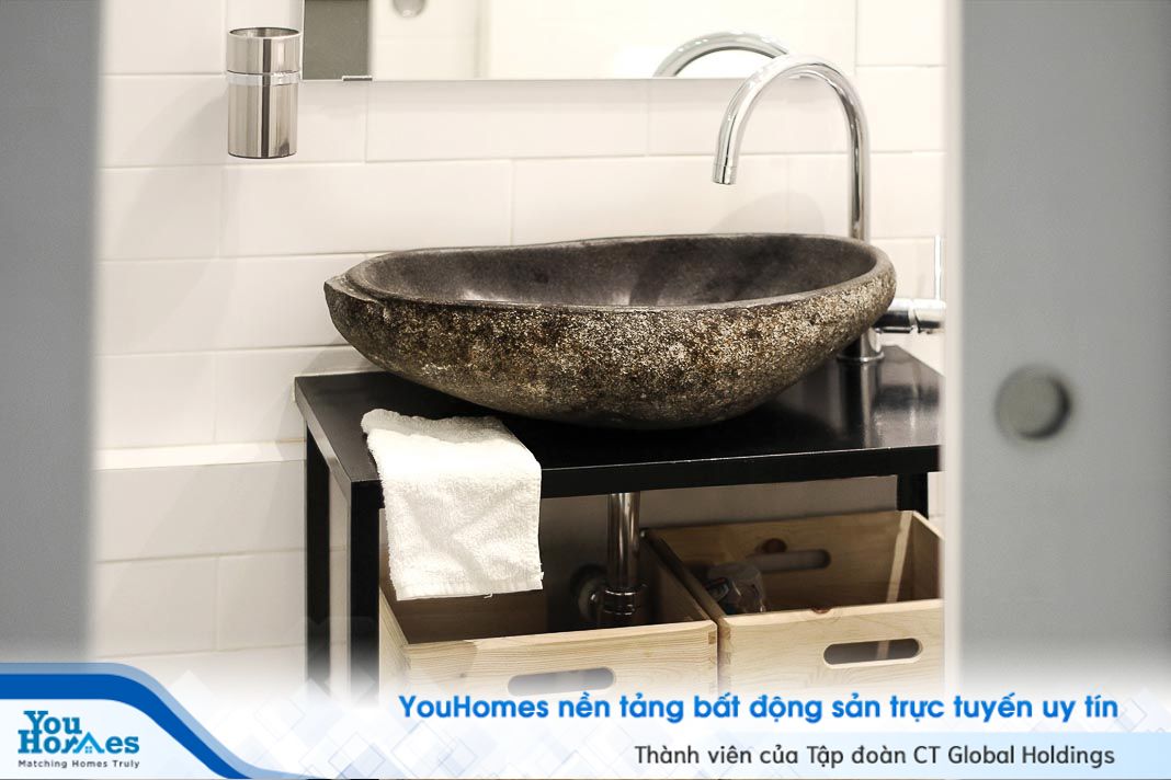 Chậu rửa mặt mang màu sắc khá khác biệt với thiết kế từ đá tự nhiên được đánh mịn cực kỳ nổi bật.