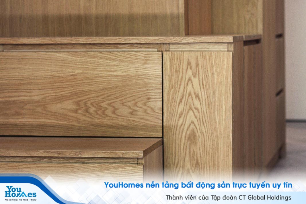 Phàn giường ngủ tầng cao được kết hợp với tủ để đồ với nhiều ngăn tủ khác nhau tạo nên góc nhỏ độc đáo trong căn phòng.