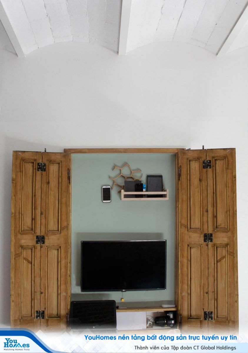 Tivi và phần giá để các đồ dùng kỹ thuật số được khéo léo dấu trong một chiếc cửa sổ giả cực kỳ độc đáo.