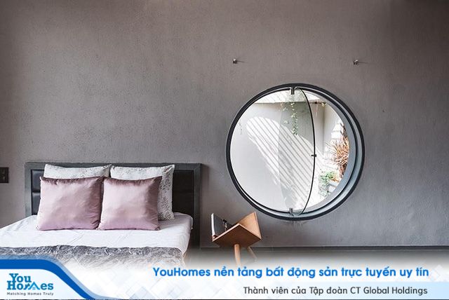 Phòng ngủ tuyệt đẹp với cửa sổ hình tròn mở ra khu vực giếng trời.