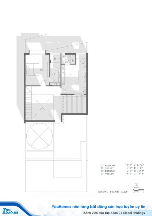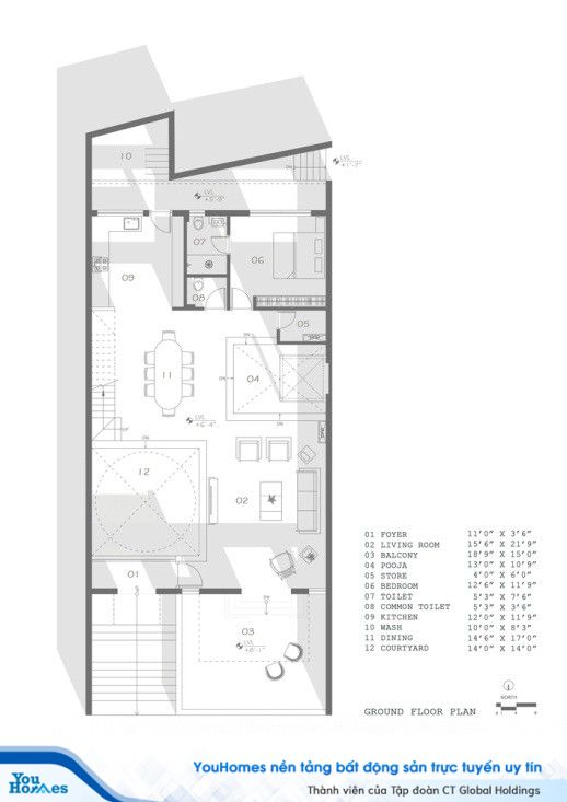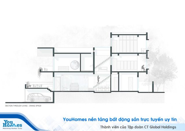 Trên tổng diện tích sàn khoảng 557m2, ngôi nhà ống được thiết kế 3 tầng với không gian tầng 1 là nơi dành cho khu vực sinh hoạt chung. Khu vực nghỉ ngơi riêng tư được đưa lên tầng cao thoáng sáng. Đối với nhà ống, việc thiết kế sao cho mang được nắng gió vào khắp các không gian là cả một vấn đề. Tuy nhiên, nhờ lợi thế về diện tích cũng như chiều dài của ngôi nhà nên toàn bộ không gian được chiếu sáng bởi hệ thống giếng trời rộng giữa nhà. Nơi đây được trồng nhiều cây đóng vai trò như một lá phổi xanh, là trái tim cho cả ngôi nhà.