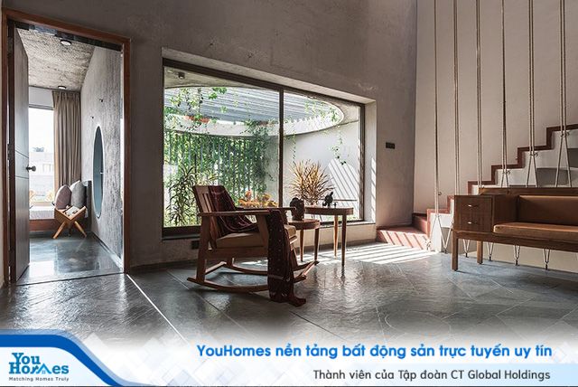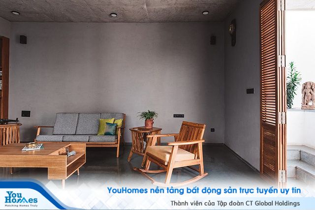 Phòng khách đơn giản với ghế băng dài, ghế bập bênh và một bàn trà gỗ đặt ngay cạnh lối vào nhà. Toàn bộ tường và trần nhà để thô kết hợp nội thất gỗ tạo nét không gian vừa xưa cũ vừa hiện đại độc đáo cho công trình.