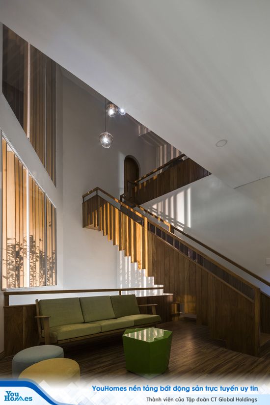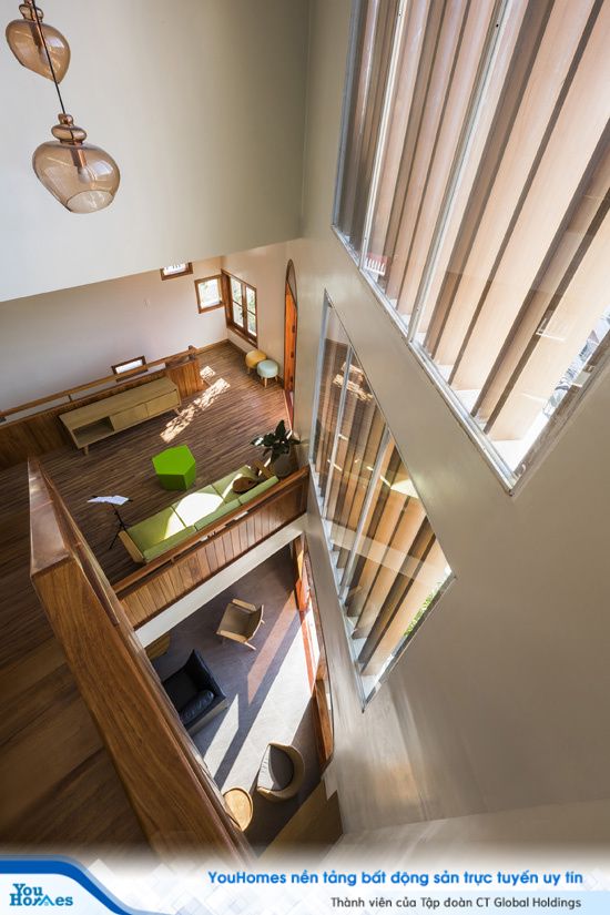 Không gian trung tâm của ngôi nhà là khoảng thông tầng với ý đồ tạo ra sự gắn kết giữa các phòng chức năng, giữa các thế hệ… Hệ lam giúp giảm cường độ ánh nắng chiếu trực tiếp vào nhà. Màu gỗ trầm mộc mạc mang đến cảm giác thân thuộc và bình yên.