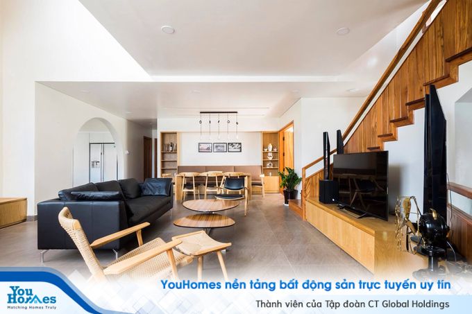 Song song với kiến trúc chịu đồng thời ảnh hưởng của biệt thự xưa và nhà hiện đại, nội thất ngôi nhà cũng là sự pha trộn giữa truyền thống và hiện đại, giống như đồ gỗ bên cạnh sofa da. Phòng khách được đặt ở khoảng thông tầng lớn giúp không gian thoáng rộng. Phòng khách và phòng ăn sử dụng chung không gian nhằm tiết kiệm được diện tích cho căn nhà.