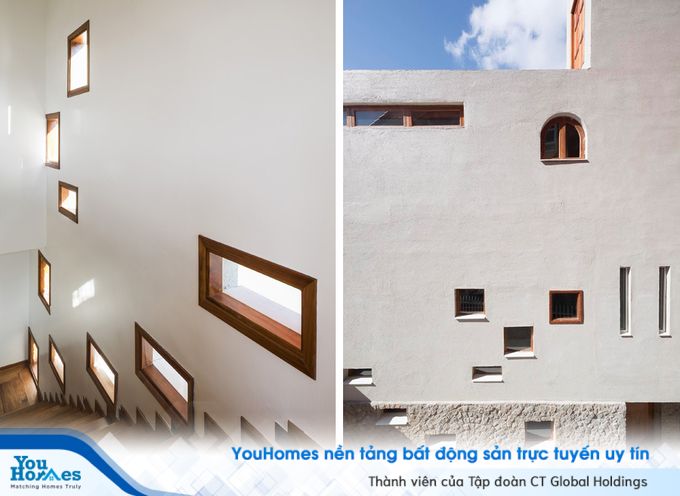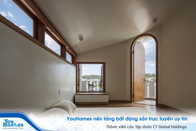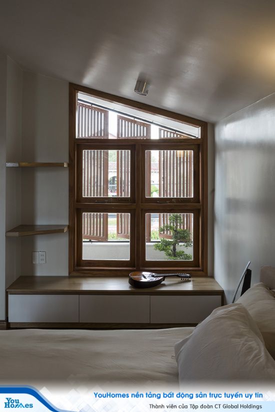 Phòng ngủ chỉ cách lớp cửa mặt tiền một khoảng thông tầng. Hai lớp cửa sổ đảm bảo cho sự riêng tư của căn phòng. Mỗi căn phòng, mỗi dạng địa hình, mỗi góc nhà,… lại là những ô cửa với nhiều hình dạng khác nhau và sự lặp lại cũng với tỉ lệ khác nhau.