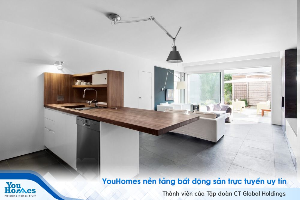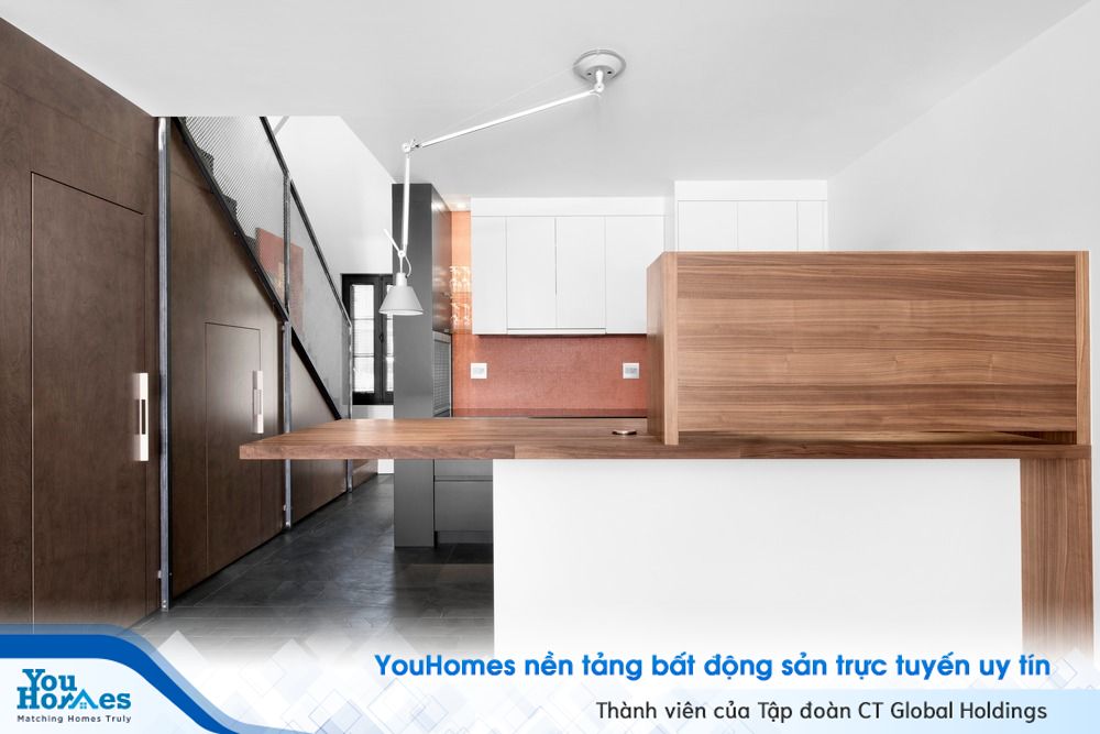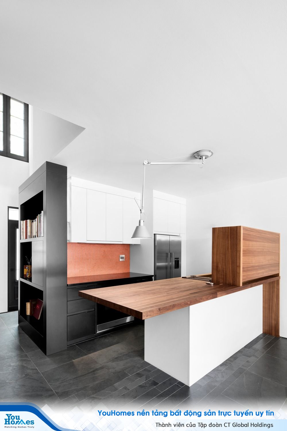 Căn bếp với diện tích lớn cùng các ngăn tủ và quầy bar tiện dụng. Bên dưới gầm cầu thang được tận dụng tối đa làm các ngăn tủ để đồ giúp tối ưu hóa không gian. Bên dưới sàn được ốp gỗ hoàn toàn tạo nên cảm giác ấm áp. Bàn ăn được tích hợp với quầy bếp tiết kiệm tối đa không gian sinh hoạt chung. Chiếc đèn bàn ăn mang phong cách hiện đại tạo nên sự độc đáo cho căn phòng.