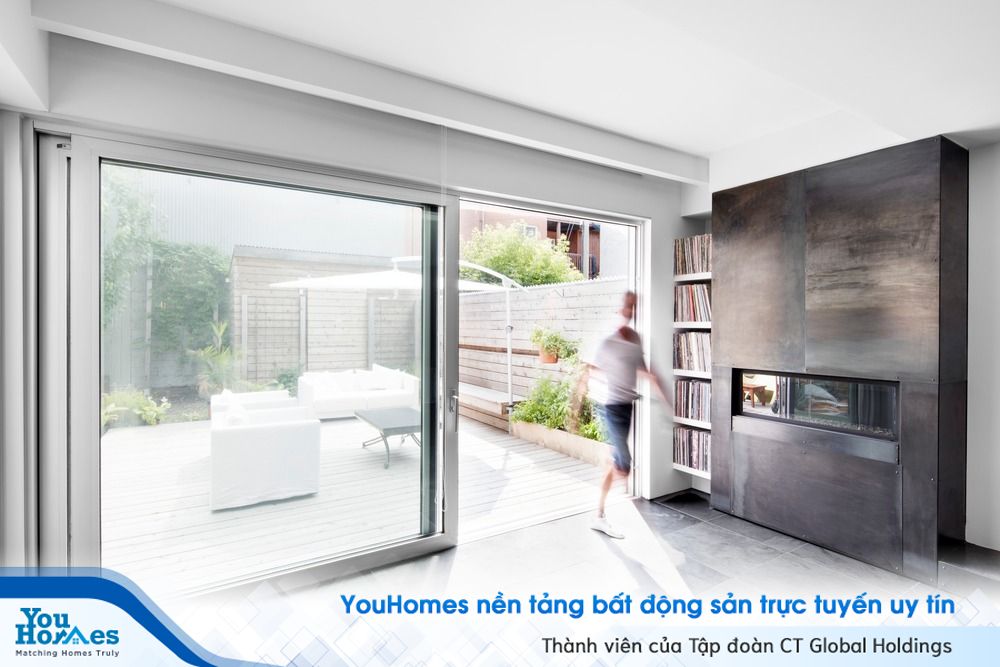 Sân vườn ngập nắng với thiết kế đẹp mắt tạo nên một không gian tuyệt vời để người sử dụng thư giãn và hít thở không khí trong lành hàng ngày. Bên ngoài sân vườn cũng có một kho chứa đồ nhỏ dùng để đựng các đồ dùng làm vườn giúp ngôi nhà luôn ngăn nắp và sạch sẽ. Giá sách được thiết kế nhỏ gọn bên góc nhà, bên cạnh là chiếc lò sưởi phong cách hiện đại đem lại cho nội thất ngôi nhà sự tinh tế, đồ dùng cũng được sắp xếp một cách rất khoa học.