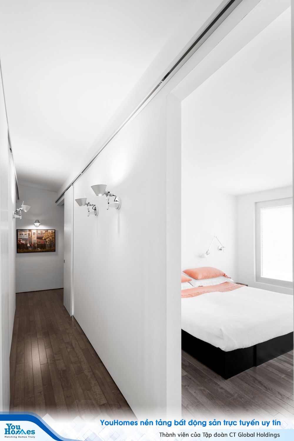 Trái ngược với bên ngoài, bên trong ngôi nhà lại được sử dụng tông màu trắng chủ đạo giúp tạo cảm giác ngôi nhà rộng và thông thoáng hơn. Toàn bộ mặt sàn được ốp gỗ đem lại cảm giác ấm cúng, thoải mái và tiện dụng.