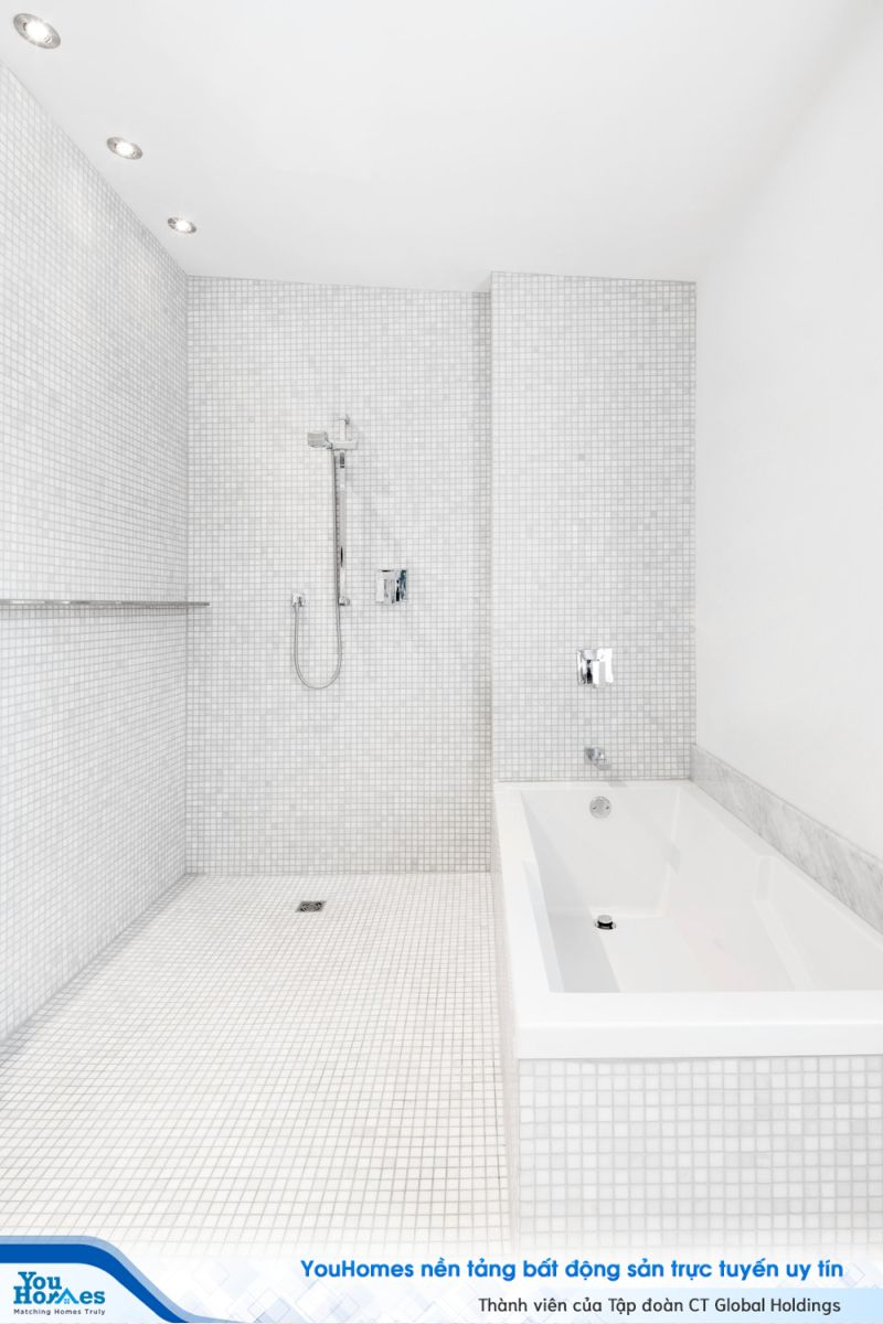 Phòng tắm độc đáo với gạch ốp mang họa tiết các ô vuông nhỏ. Với diện tích lớn, căn phòng có cả bồn tắm và vòi tắm đứng, giúp đáp ứng tốt nhu càu của người sử dụng.