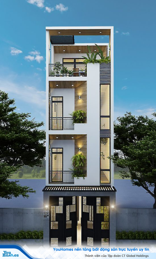 Ngôi nhà ống với mặt tiện nhỏ được xây cao 4 tầng với phong cách hiện đại được sử dụng chủ đạo 3 tông màu trắng - đen - nâu. Ngôi nhà được thiết kế đặc biệt với khoảng góc khuyết tại ban coogn được dùng đề trồng cây xanh.Tầng 4 được thiết kế ban công rộng hơn các tầng khác và trử thành một khu vườn thu nhỏ của gia chủ. Một nơi thư giãn lý tưởng mỗi khi thời tiết mát mẻ.