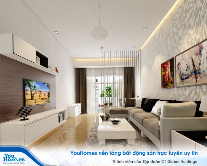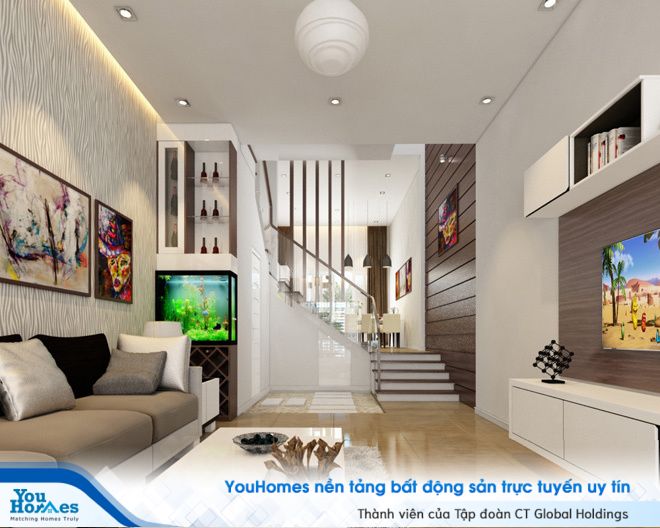 Phòng khách hiện đại với gam màu chủ đạo là màu trắng kết hợp với sàn màu nâu mang đến cảm giác sang trọng và tinh tế. Bộ sofa kê sát tường đối diện kệ tivi giúp tiết kiệm không gian, tạo lối đi rộng cho phòng khách. Kệ tivi có các ngăn có thể chứa được các vật dụng nhỏ giúp căn phòng ngăn nắp hơn. Bức tranh nghệ thuật tạo điểm nhấn đặc sắc cho phòng khách. Bể cá vừa có tác dụng trang trí phòng khách thêm sinh động còn còn tốt cho phong thủy của phòng khách mang nhiều sinh khí tốt, hút tài lộc vào nhà.