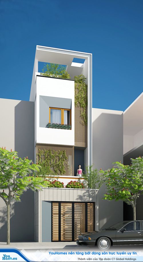 Mặt tiền của ngôi nhà thiết kế lạ mắt tạo điểm nhấn riêng cho ngôi nhà. Những thanh lam được sử dụng như tạo được ngôn ngữ riêng, nói lên nét đặc biệt, tính thoáng mát của nó. Cách thanh lam còn làm giàn leo cho các cây xanh leo và bám vào làm đẹp và làm mát cho ngôi nhà.