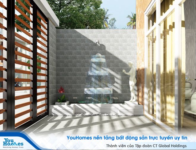 Phần sân trước chủ nhà không dùng để ô tô vì thế được thiết kế với diện tích vừa phải. Một tiểu cảnh thác nước được thiết kế đặt cạnh tường giúp phần sân trước nhà thêm sinh động, góp phần giúp phong thủy của ngôi nhà tốt hơn.