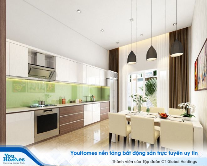 Màu sắc nhẹ nhàng mang đến sự tinh tế cho căn bếp. Bếp được thiết kê dạng chữ I sát tường khiến không gian phòng bếp rộng rãi hơn. Hệ tủ treo, các ngăn tủ giúp lưu trữ được các vật dụng trong bếp và thuận tiện quá trình sử dụng.