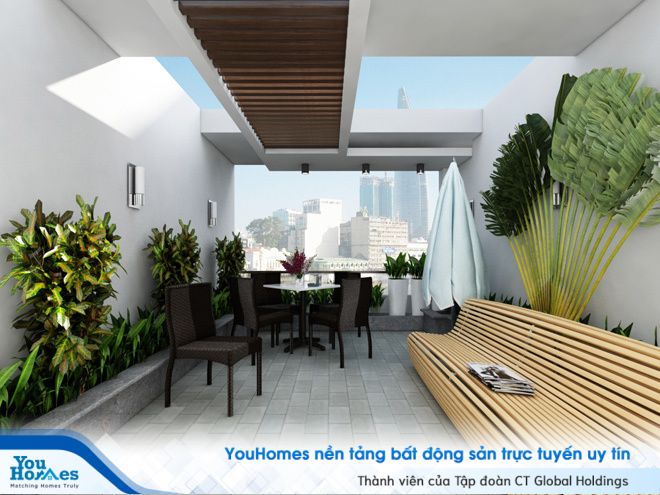 Trên sân thượng bố trí phòng thờ phía trước, khu giặt phơi phía sau và nhiều khoảng sân để ngồi thư giãn, trồng cây cảnh, rau.