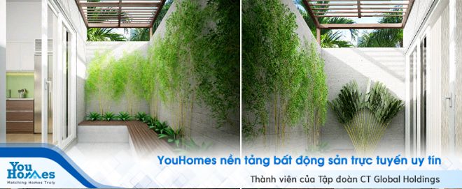 Khu vực sân sau được trồng các loại cây cối tạo cảm giác gần gũi với thiên nhiên. Trúc, chuối cảnh,... được trồng đan xen nhau và có chỗ ngồi để gia chủ có thể thư giãn.