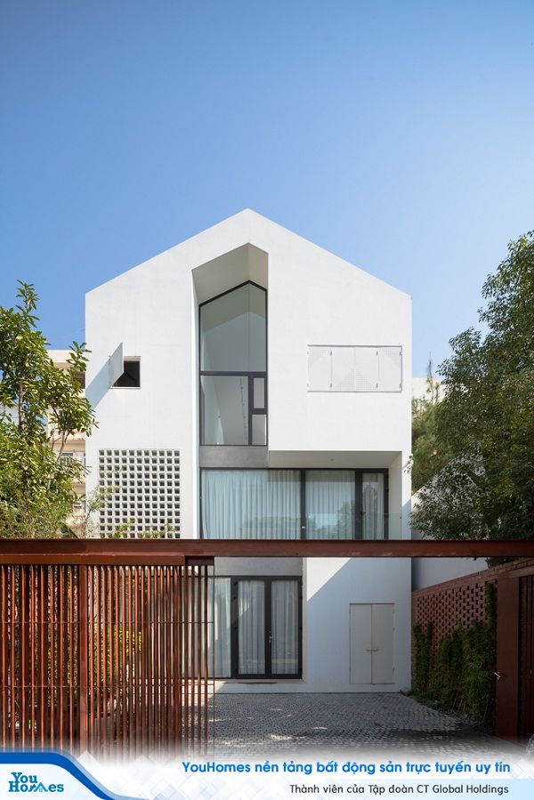 Căn nhà phố nôi bật với màu trắng đơn giản mà tinh tế kết hợp cùng khoảng sân rộng rất tiện lợi cho sinh hoạt. Cổn sắt nâu với thiết kế chắc chắn và kiên cố nhưng lại không quá bí bách như một chiếc chuồng cọp. Cây xanh cũng là một yếu tố không thể thiếu giúp hoàn thiện vẻ bên ngoài của căn nhà, cung cấp thêm sức sống và thanh lọc không khí.