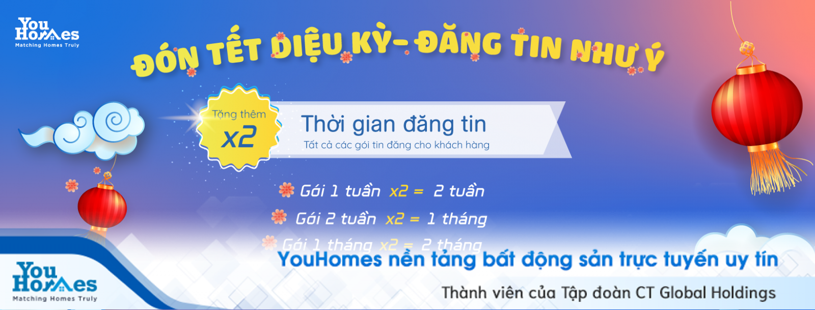 Mừng xuân Canh Tý, YouHomes tri ân khách hàng với chương trình ưu đãi đặc biệt, đừng bỏ lỡ cơ hội được nhân đôi thời gian đăng tin với mọi gói tin, khám phá ngay!