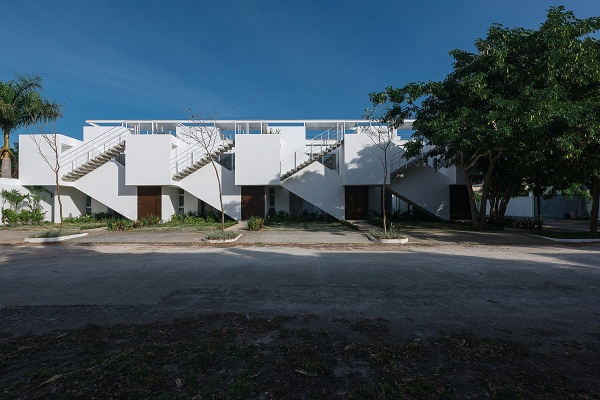 Bạn biết không, mặt tiền của dải nhà hình hộp chữ nhật này được khoác lên mình lớp áo cầu thang bê tông bắc cầu, kéo dài ở hai đầu, mỗi đầu cầu thang bắc cầu gắn liền vối một ô ban công nhỏ. Chúng như tạo cho bạn cảm giác đi thang máy ngoài trời vậy mà ở đó mỗi ô ban công là một bệ đỡ giúp bạn có thể ngắm trọn vẹn khung cảnh xung quanh tòa nhà. Thật thú vị.