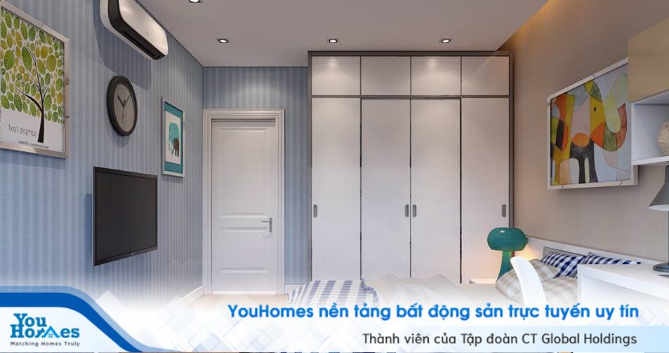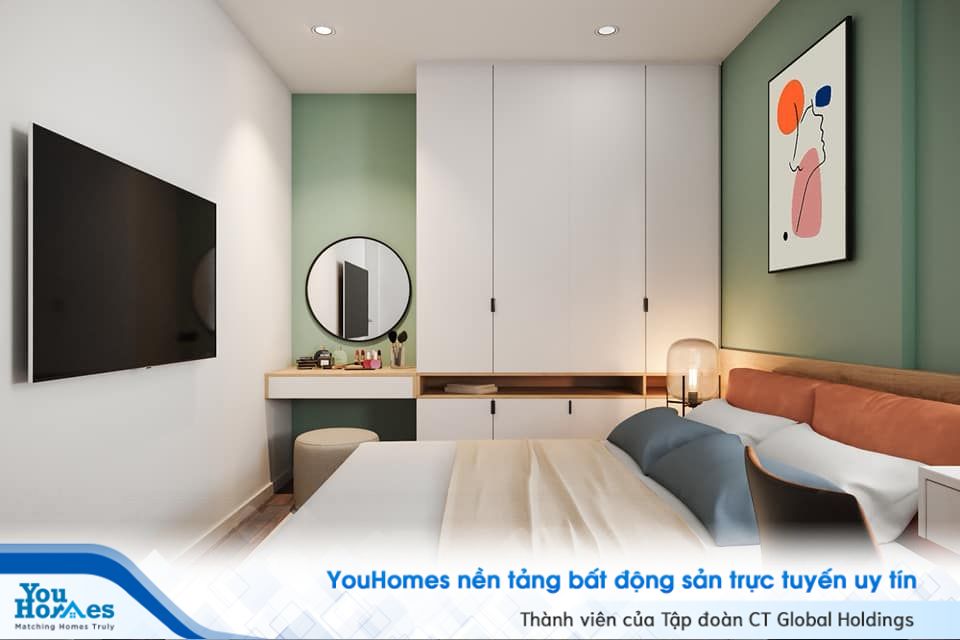 Ở một góc nhìn khác, ta thấy được những tiện nghi khác của căn phòng. Giường được kê sát vào tường để tạo cảm giác an toàn, chắc chắn khi ngủ. Thêm vào đó, chiếc giường này còn được tích hợp tủ đựng phía dưới vô cùng đa năng, tiện lợi. Tủ đựng đồ được đặt ngay dưới chân giường, vừa khít với tường tận dụng tối đa không gian trong phòng, nhờ vào đó căn phòng trộng rộng rãi, thoáng mát hơn. Một mặt chiếc tủ đó là chứa quần áo, trang phục, mặt khác nó lại là chiếc kệ trang trí đẹp mắt.
