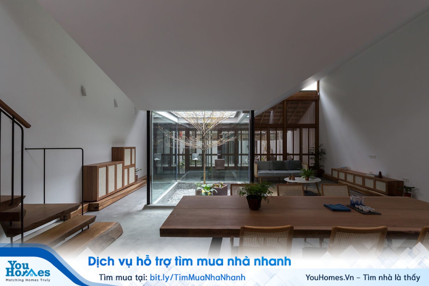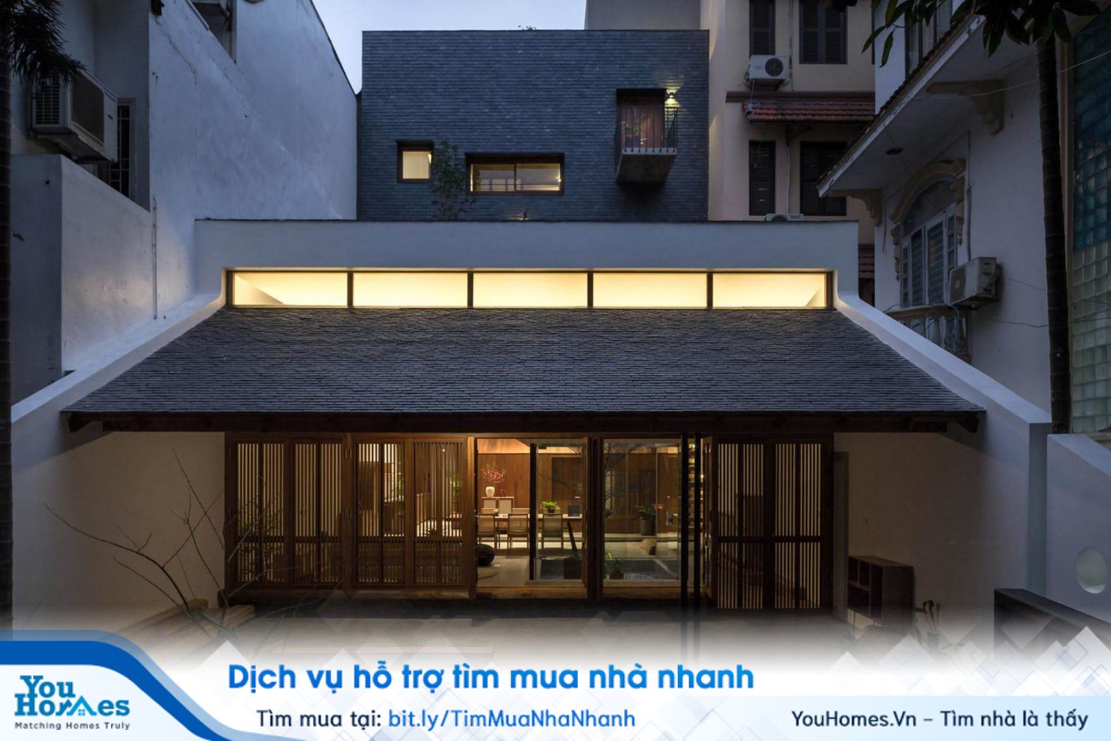 Gần gũi là cảm giác đầu tiên khi nhìn thấy căn nhà, dù thiết kế của nó vô cùng độc đáo và hiện đại. Bởi các kiến trúc sư của AHL Architects đã thiết kế không gian có sự kết hợp Đông - Tây, được lấy ý tưởng từ những ngôi nhà mái ngói truyền thống của người dân Bắc Bộ.
