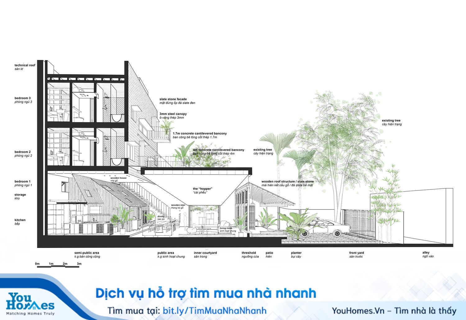 Dưới đây là những chia sẻ từ các kiến trúc sư của Tropical Space – những người trực tiếp tạo căn nhà đặc biệt này. Nó được lấy cảm hứng từ ngôi nhà truyền thống, được thiết kế theo 3 không gian riêng biệt cùng mái dốc thể hiện sự hiện đại và mạnh mẽ.