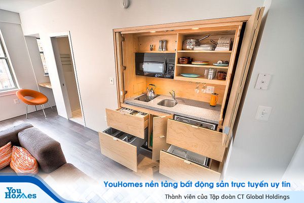 Chiếc tủ thông mình giúp cất gọn tất cả đồ dùng và khi đóng cánh cửa lại, căn phòng lại trở nên ngăn nắp.