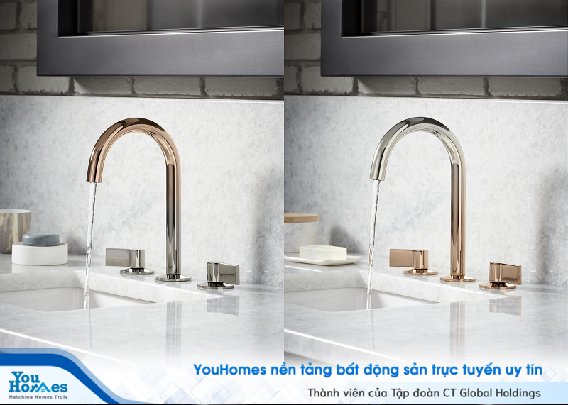 Bộ sưu tập vòi Components Vibrant Ombré từ Kohler sử dụng kỹ thuật sáng tạo kết hợp với hai lớp màu kim loại rực rỡ để tạo ra sự chuyển đổi tinh tế nhưng nổi bật từ sáng sang tối, tường được ốp từ đá Maple sang trọng mang đến vẻ độc đáo cho không gian căn hộ.