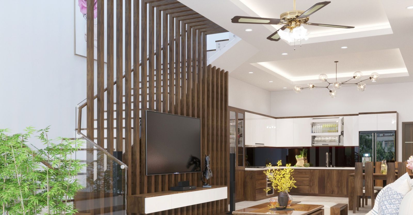 Tivi kết hợp với vách ngăn lam gỗ là một trong những sự lựa chọn hàng đầu được các gia đình Việt. Không chỉ tối ưu hóa không gian phòng khách, mà vách ngăn còn giúp che đi phần chân cầu thang không đẹp mắt.