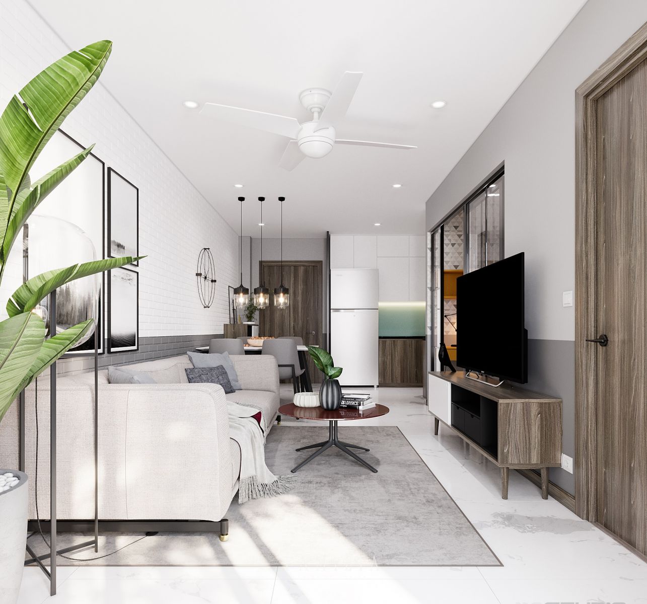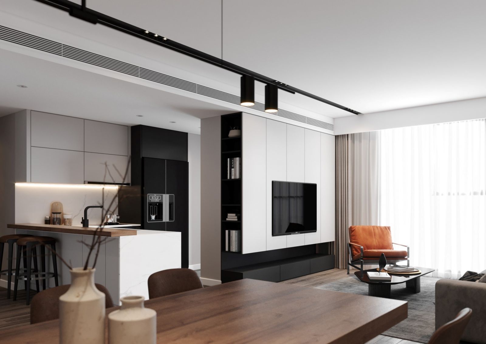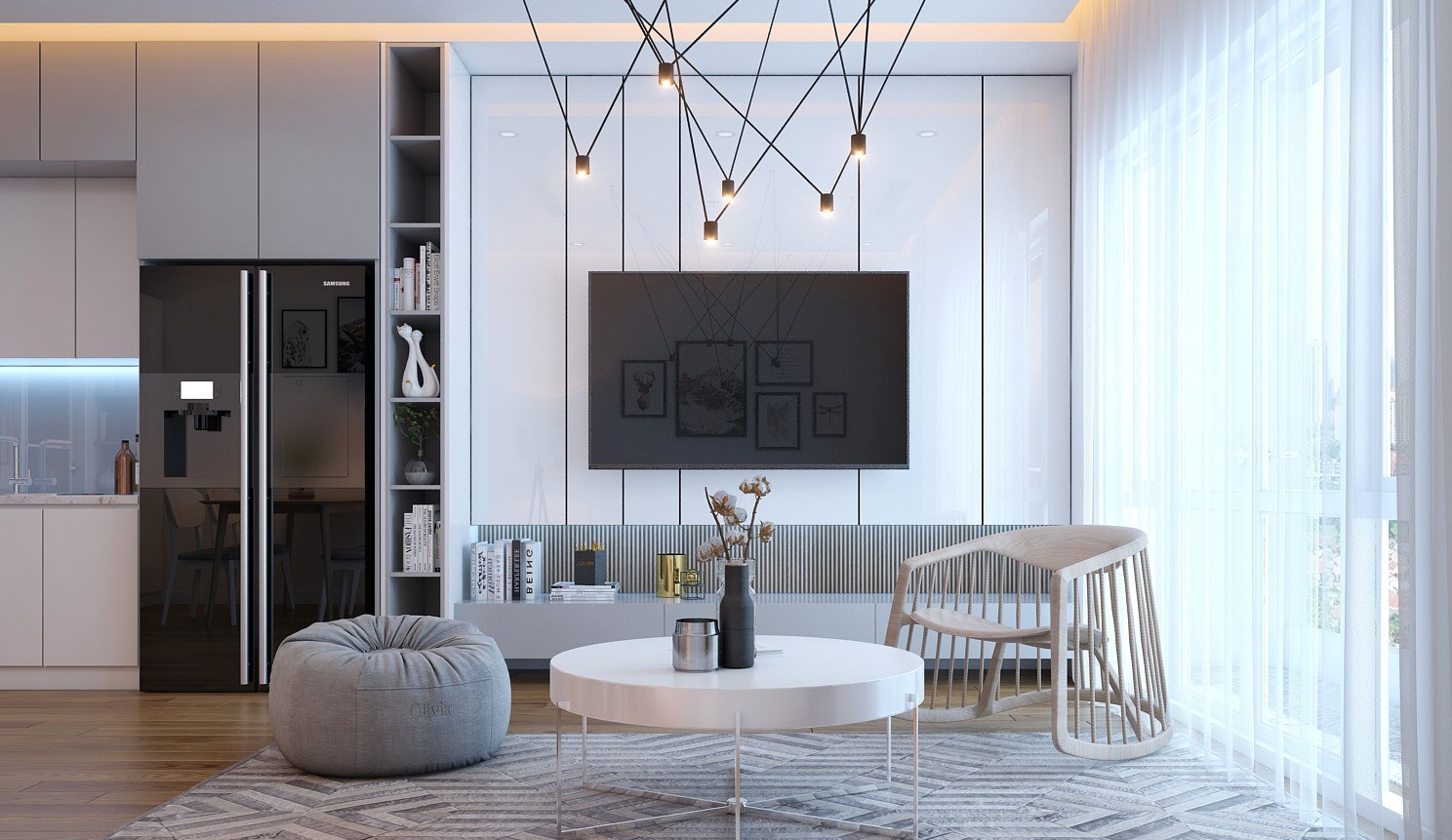 Sử dụng tông màu trắng chủ đạo là mẹo đánh lừa thị giác giúp căn hộ của bạn như rộng hơn, nhưng nó cũng có một hạn chế nhất định. Đó là nếu bạn để cho khoảng trắng này quá nhiều sẽ tạo nên tổng thể nhàm chán, buồn tẻ. Và giải pháp cho bạn chính là sử dụng một chiếc tivi màu đen ở chính giữa khoảng trắng ấy, đây chính là điểm nhấn đặc biệt trong không gian phòng khách.