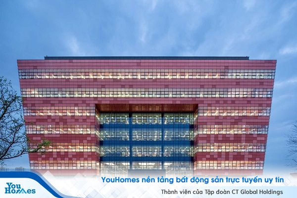 Những khối ốp màu hồng nhạt, đỏ nâu đậm xếp xen kẽ với nhau tạo nên một lớp áo kiến trúc mới lạ, bắt mắt.