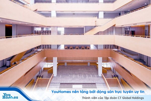 Bên trong, thư viện tận dụng lối thiết kế phân tầng, thể hiện rõ qua các dãi hành lang uống cong khéo léo.
