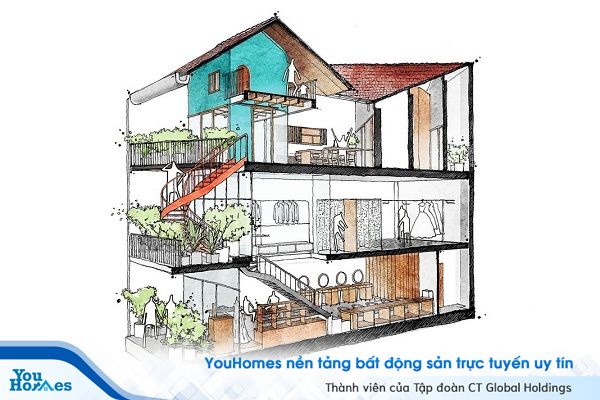 Lấy cảm hứng từ lối sống, phong tục của ngôi nhà ba gian ở miền Trung Việt Nam, các kiến trúc sư đã đề xuất giải pháp thiết kế ngôi nhà đa tầng, đa chức năng, các tầng xếp chồng đan xen lên nhau theo chiều dọc.