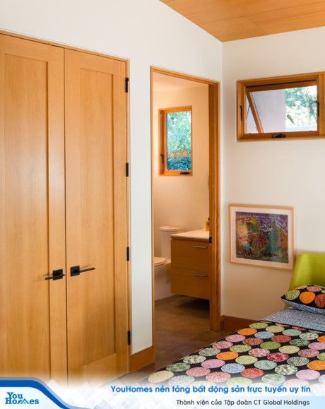 Phòng ngủ với nội thất gỗ hiện đại ấm áp cùng với chiếc giường nhiều màu sắc sinh động.
