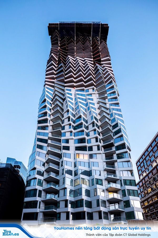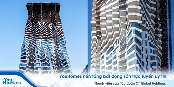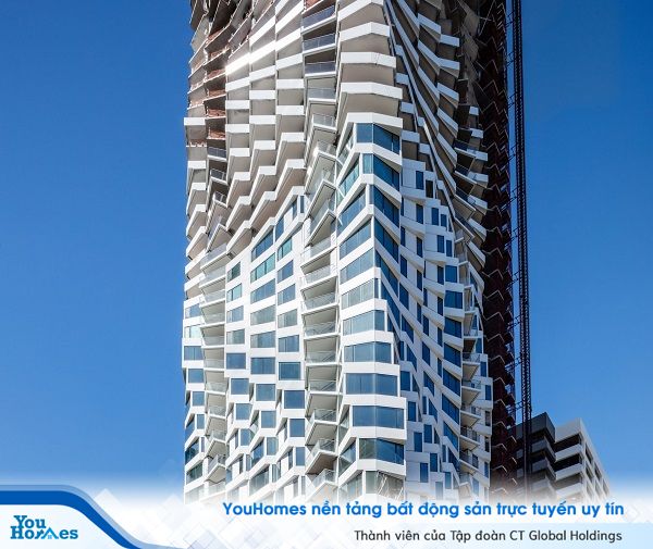 Các khu vực ban công, cửa sổ các căn hộ trong tòa tháp được thiết kế ở dạng hình hộp, có các đường nét kiến trúc dị dạng, xiêng vẹo lạ mắt.