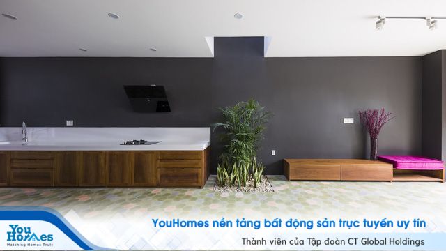 Với gam màu tối chủ đạo của tường thì trần nhà được lựa chọn màu trắng nổi bật kết hợp với sàn nhà lát gạch họa tiết lục giác mang đến sự hài hòa, tinh tế. Khu bếp và kệ tivi được đặt theo chiều dọc của ngôi nhà. Kệ ti vi và khu khu bếp được đặt sát tường giúp tiết kiệm diện tích và tạo cảm giác thoáng, rộng hơn cho ngôi nhà ống.