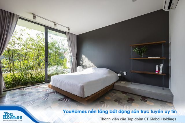 Phòng ngủ được thiết kế đơn giản với cửa kính cao sát trần giúp căn phòng hứng được toàn bộ ánh sáng tự nhiên chiếu từ bên ngoài vào. Hàng cây xanh mát trồng phía bên ngoài ban công giúp cho không khí trong lành hơn và tạo cảm giác mát mẻ hơn cho căn phòng. Bức tường màu tối là điểm nhấn cho phòng ngủ. Sàn nhà vẫn sử dụng họa tiết hình lục giác tuy nhiên, màu sắc và hoa văn đã được cách điệu để phù hợp với không gian phòng ngủ hơn. Từ trong phòng ngủ có thể nhìn ngằm dược khung cảnh thiên nhiên bên ngoài qua cửa kính lớn với hàng cây xanh mát.