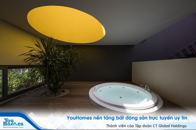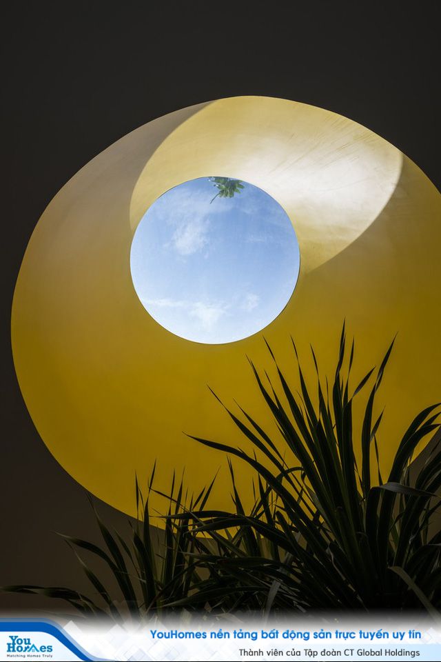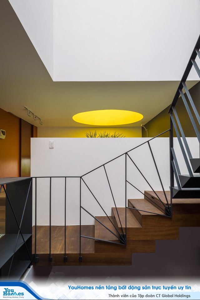 Giếng trời có diện tích nhỏ, kết hợp với màu sơn vàng tạo ấn tượng mạnh.