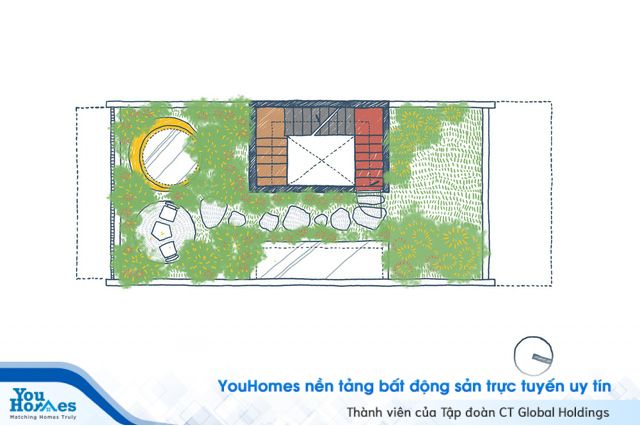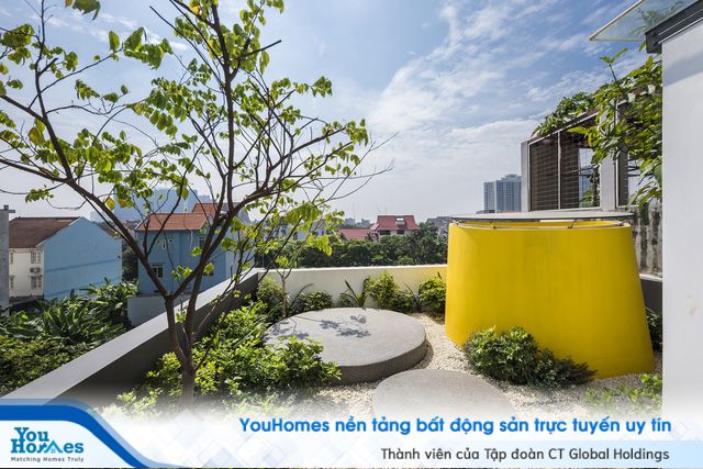 Sân thượng được rải sỏi trắng và trồng nhiều cây.