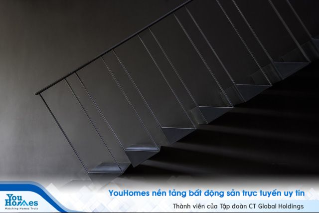 Cầu thang hiện đại, kết hợp giữa gỗ và kim loại.