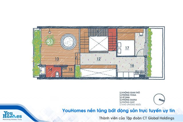 Tầng 3 gồm 1 phòng ngủ và 1 phòng yoga. Trong đó, phòng yoga lấy ánh sáng từ giếng trời.